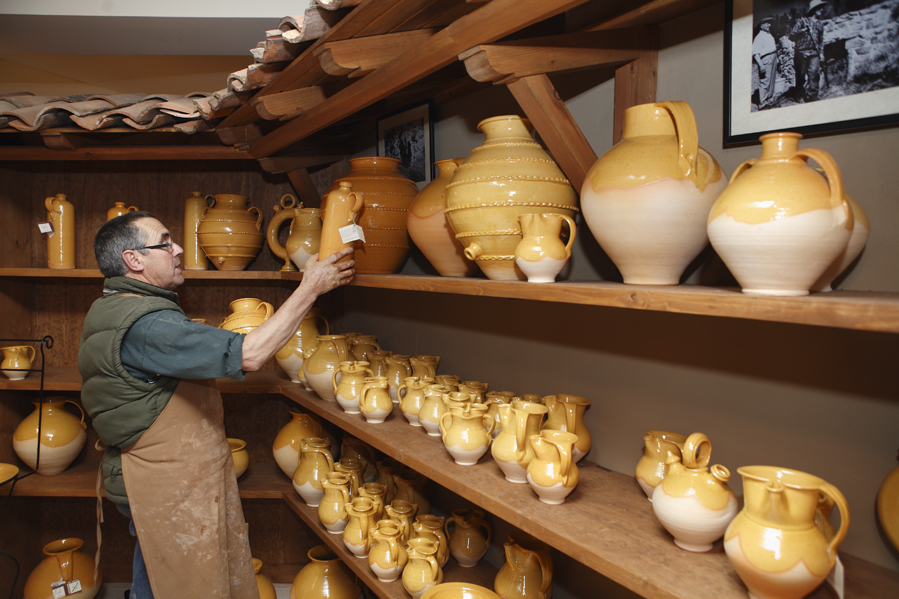 Agustín Vázquez, de 53 años, es uno de ellos. En su tienda-taller nos muestra las piezas tradicionales de esta alfarería que se distingue por la discreción de sus formas, el color amarillo del barro blanco esmaltado y su decoración estriada, y su conversación transmite a las claras la añoranza de un tiempo en el que los cacharreiros eran conocidos en los pueblos de los alrededores como calleiros, porque después de las ferias acostumbraban a ir a comer callos con el dinero obtenido; una época en la que los alfareros comían juntos, hablaban de las piezas que creaban y cocían en comunidad. Agustín se emociona cuando muestra su temor al peor de los presagios para esta alfarería porque no hay quien coja el relevo en el futuro.