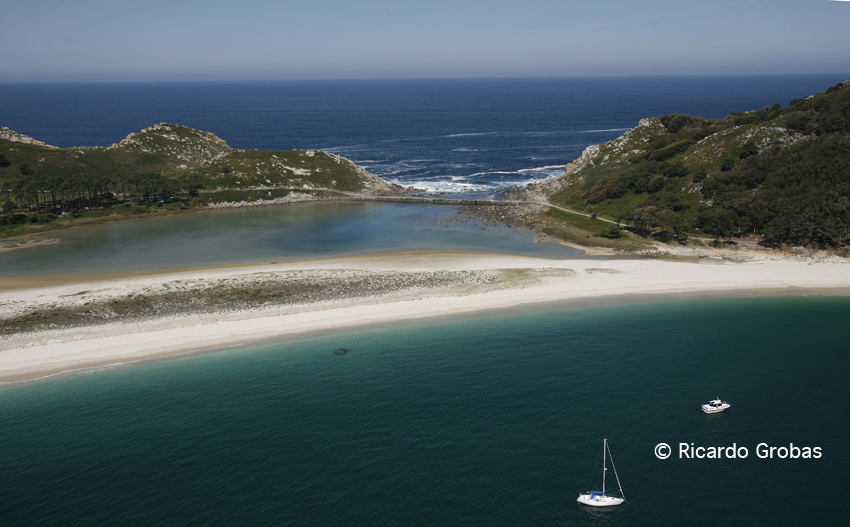 2.- Las playas de arena blanca. La más conocida es la Rodas, que une las islas de Monteagudo y Faro. Por su tamaño y el conjunto que forma con las dunas se lleva todos los halagos, pero la playa de Figueiras –en la isla de Monteagudo– y la de Nosa Señora –en la de Faro–, tienen el encanto de ser más pequeñas y menos transitadas. La playa de San Martiño, en la isla Sur, es otro paraíso, pero a ella solo se puede acceder en barco privado.