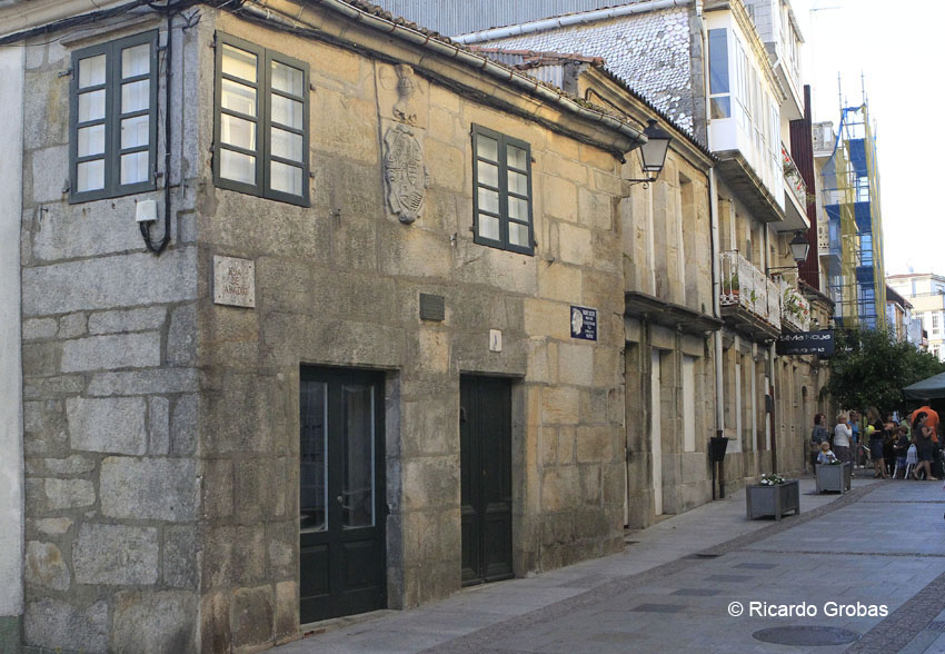 dos casas después, la de Dieste, con una placa y un escudo en la fachada.